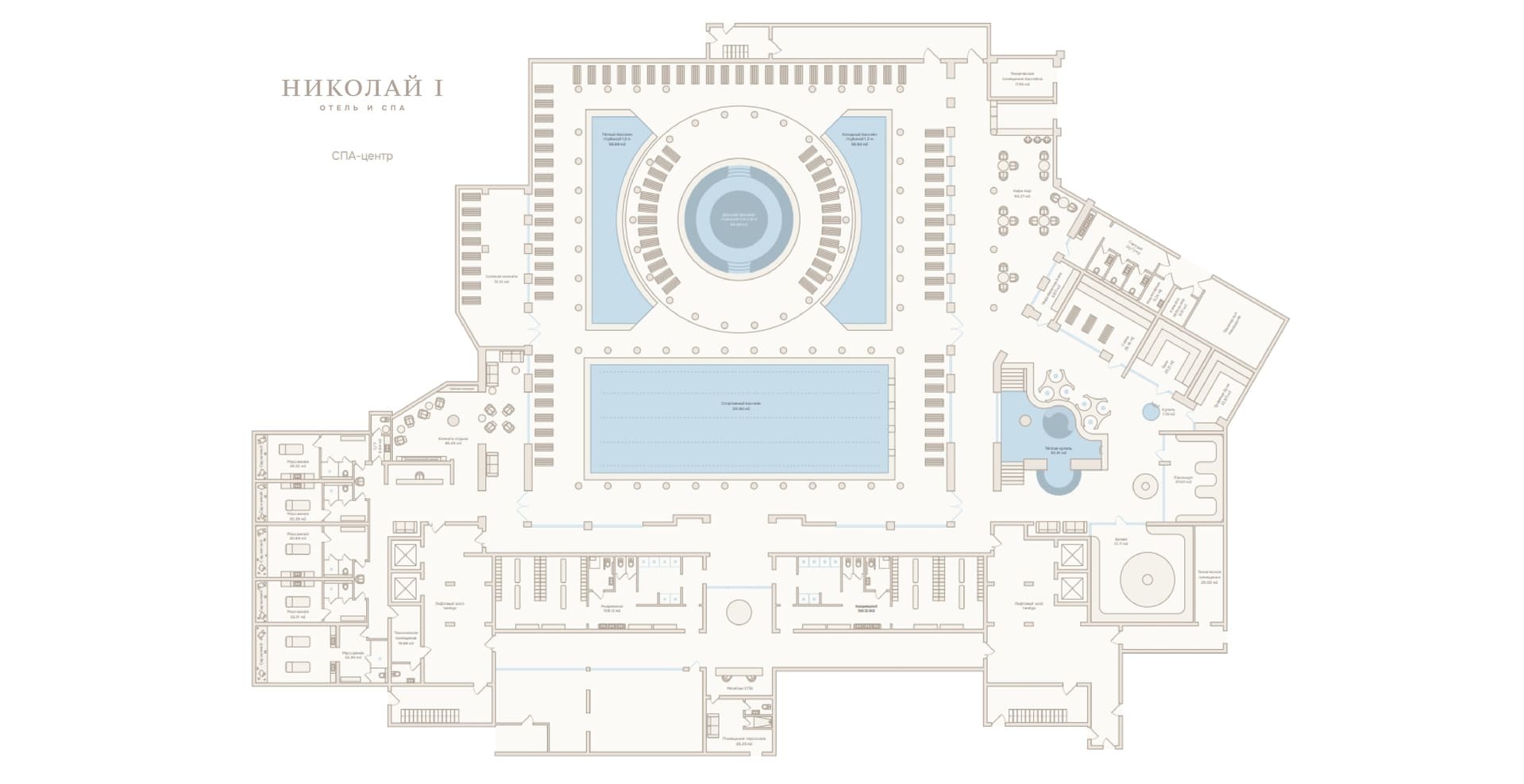 Русская баня, после которой окунуться в ледяную купель – святое дело. Лакониум, инфракрасная, финская и травяная сауны – греться и вдыхать ароматы лесов и полей. Хаммам, джакузи с гидромассажем, фито-бар, и соляная комната. Спортивный бассейн длиной 25 метров, два симметричных полукруглых бассейна и детский бассейн между ними.
